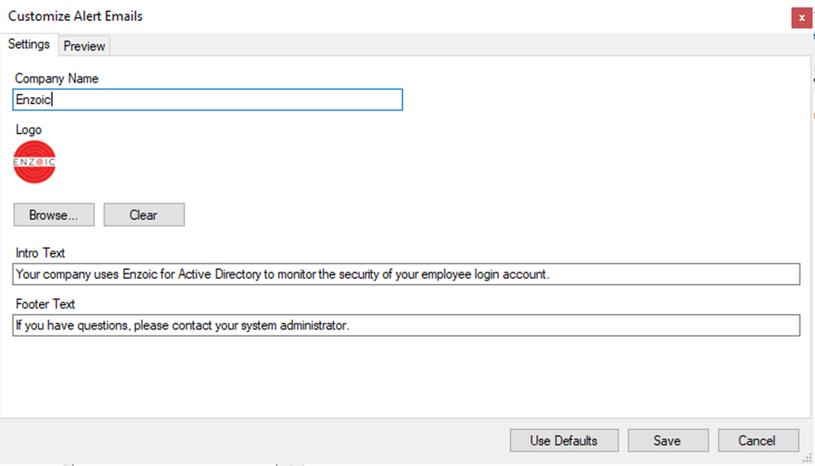 Clicking “Customize Email” allows you to customize the alert emails sent to users. You can add your company name, corporate logo and customize the Intro and Footer text in the email.