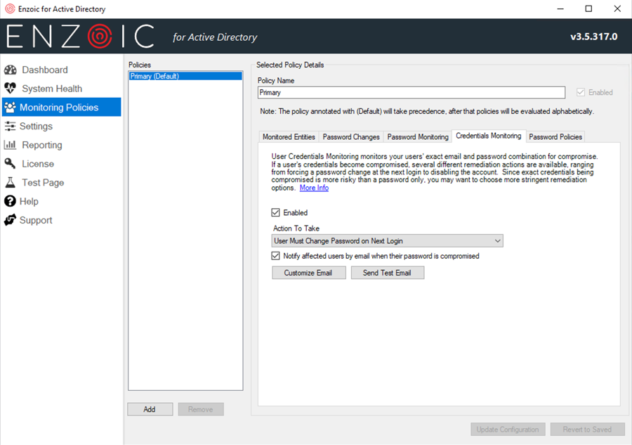 When enabled, User Credentials Monitoring (if available for your license level) checks once every 24 hours to determine if any monitored users’ credentials have become compromised. This is different from User Password Monitoring in that the exact email/password combination for the user is checked for compromise, rather than just the password. Since a compromise of this nature is much riskier, you may wish to select more stringent remediation options when this occurs.