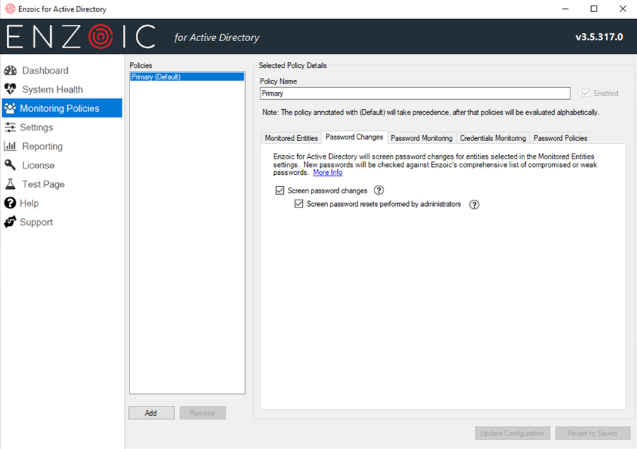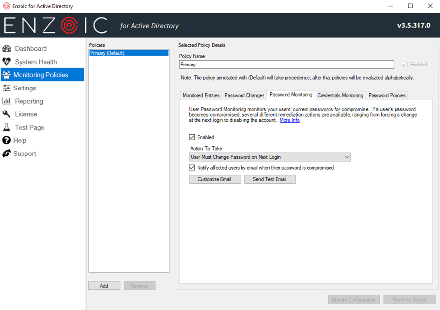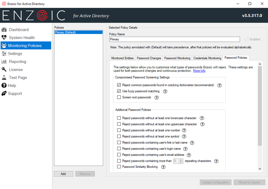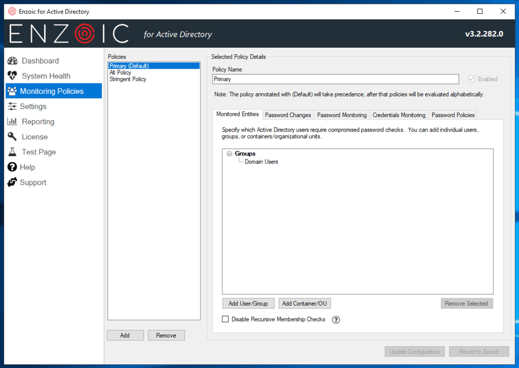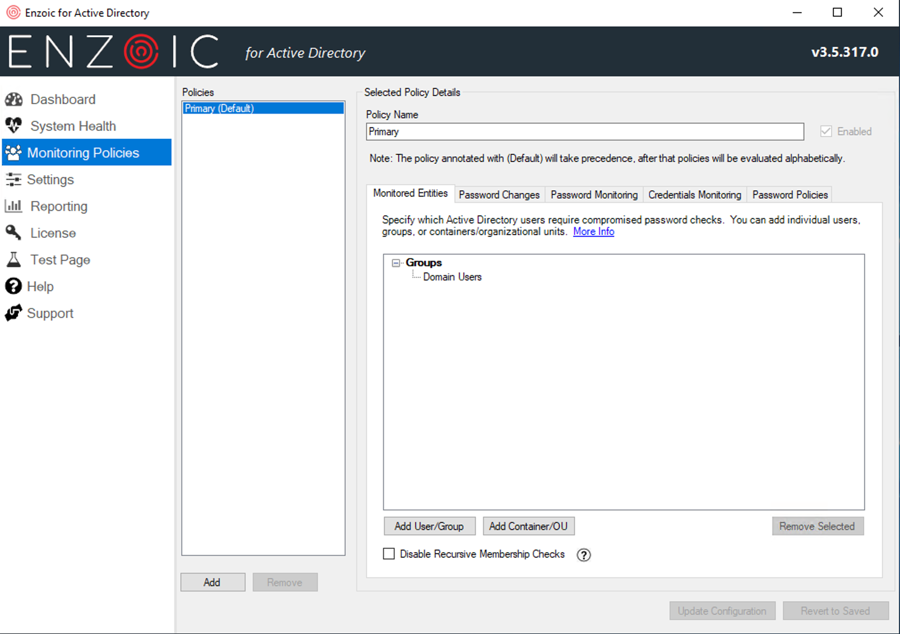 The Monitoring Policies page of the Enzoic Console allows you to add, edit, and delete new Monitoring Policies. Note that if you are on a Business level license, you will be limited to a single policy named “Primary”, but for other license levels you will be able to define multiple monitoring policies to target different groups and OU’s with different monitoring settings.
