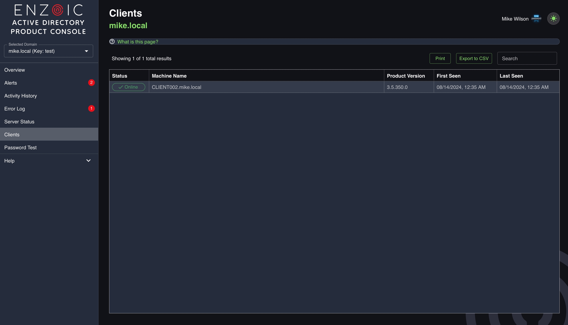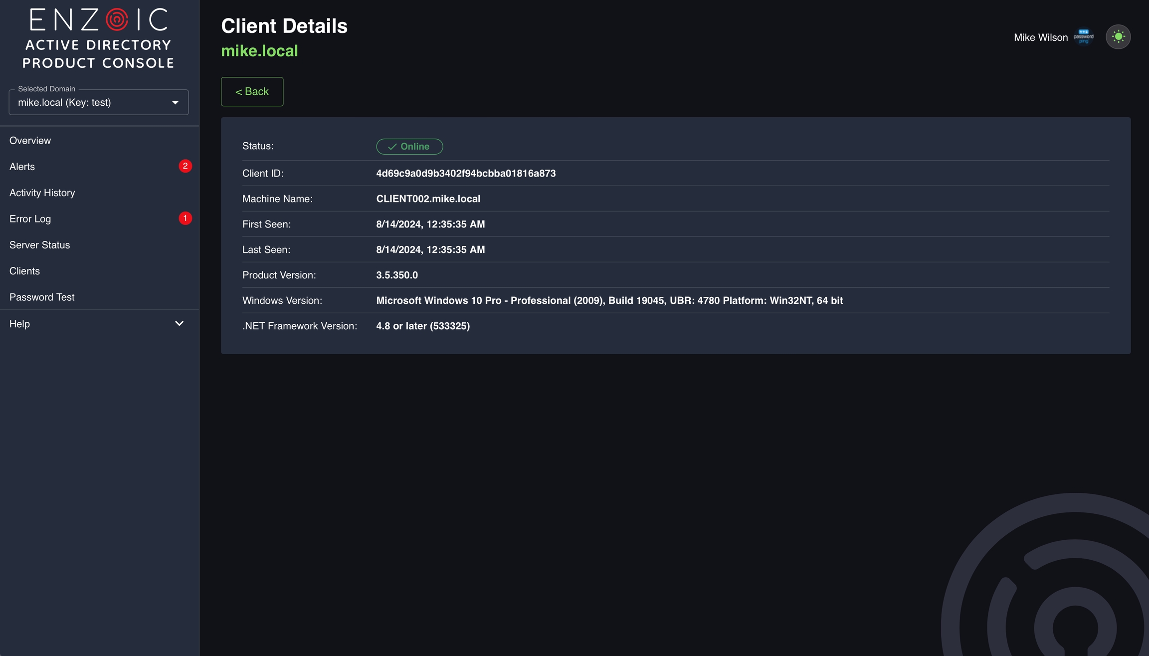 The Clients page is a listing of all Windows PCs in your organization that have the Enzoic Client installed. Click on a client to view more details:
