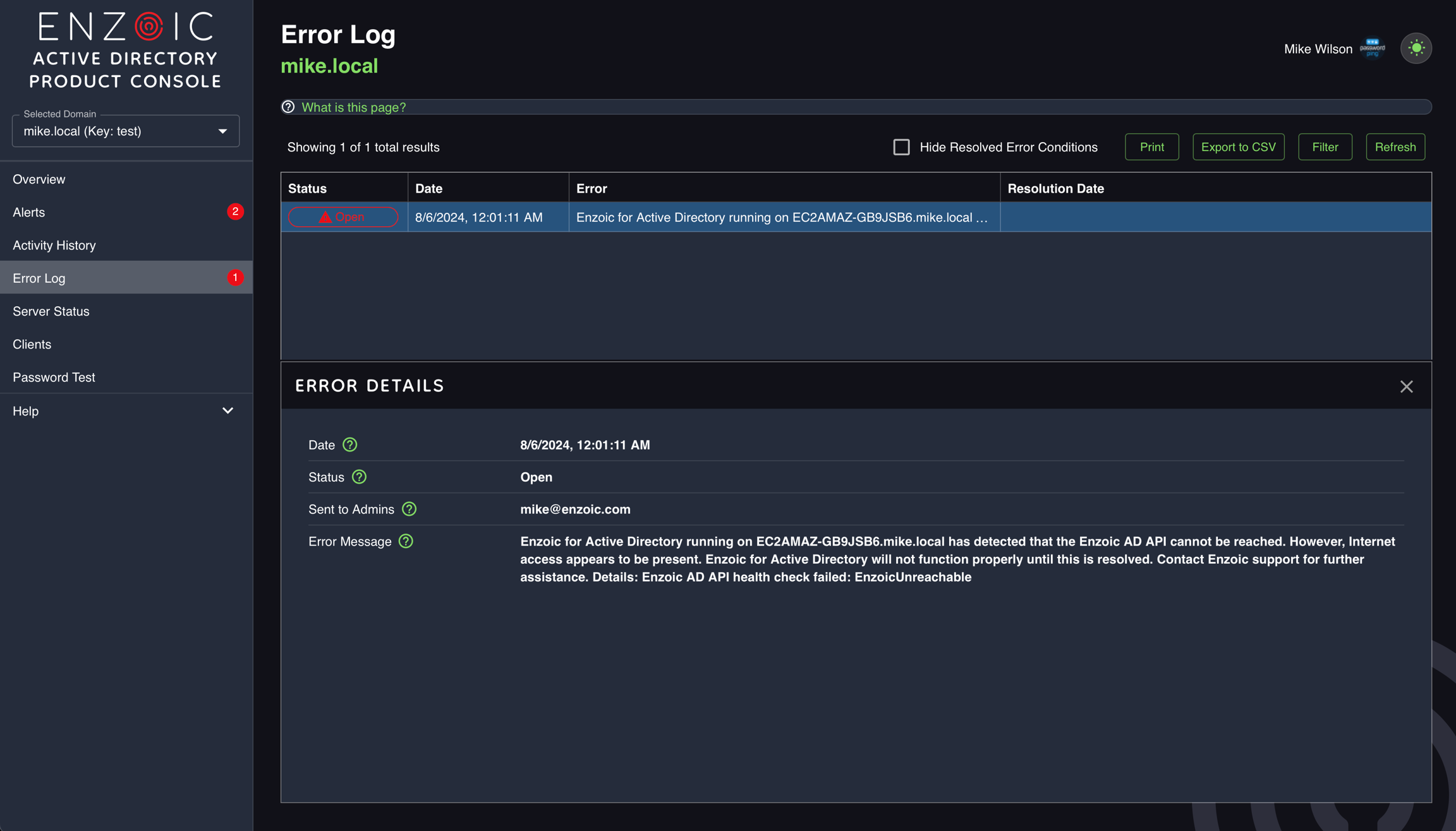 Open This is an open error condition that needs to be addressed. An example might be a misconfiguration preventing Enzoic from checking password changes. Once the error is corrected, the error status will change to Resolved.