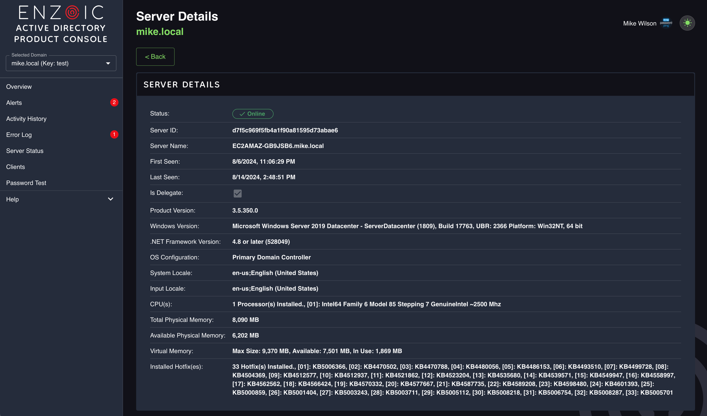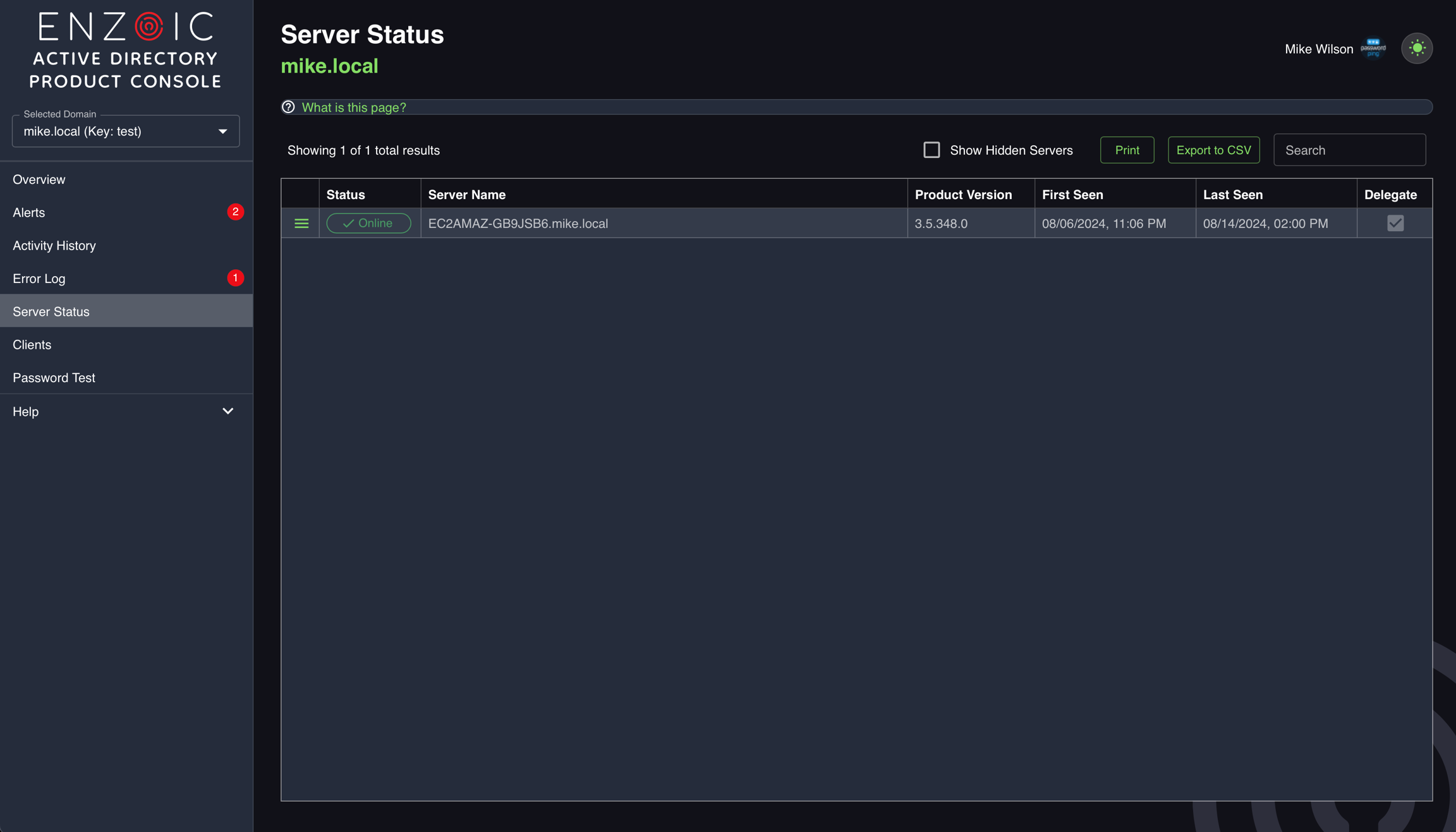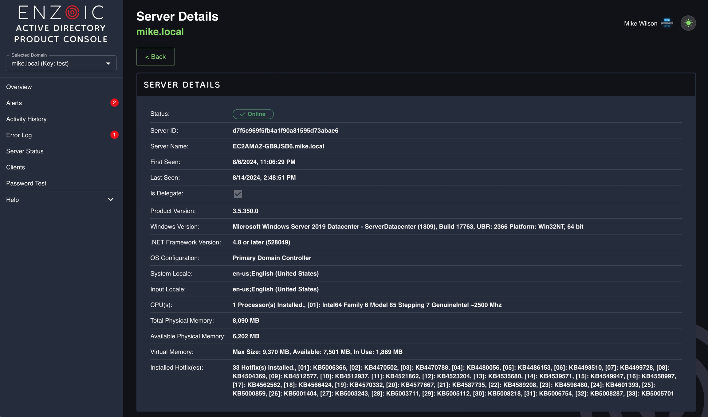 The Server Status page shows all domain controllers in your organization that have Enzoic for Active Directory installed. This allows you to easily identify servers where Enzoic is offline or having issues, and verify which version of the Enzoic software is installed on each.