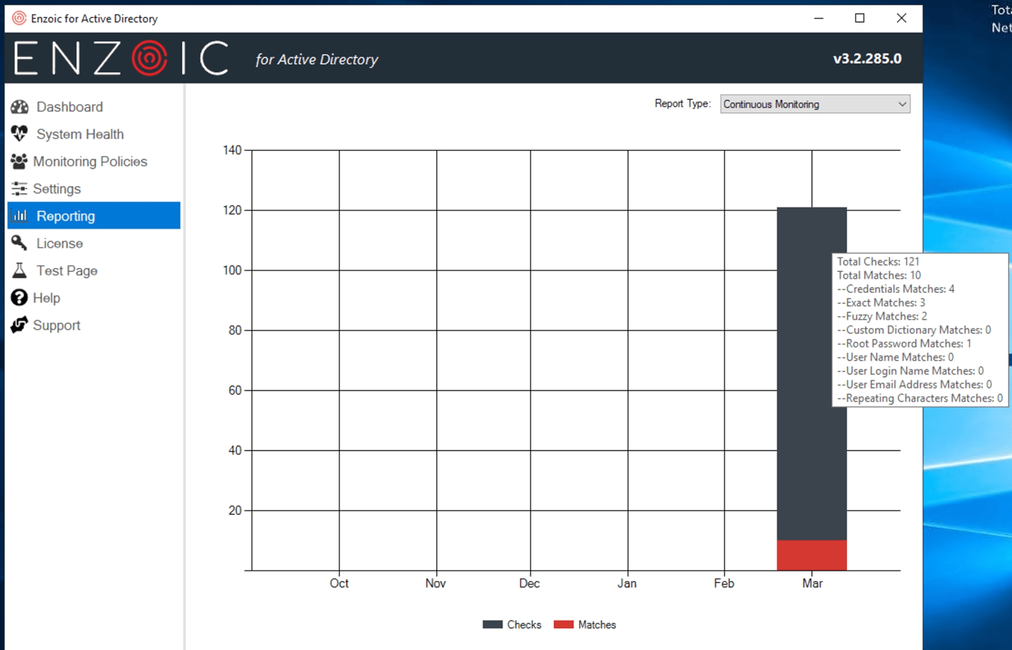 This report shows you a statistical view over time of how many user password change operations have been checked by Enzoic and how many of those ended up being matches with a compromised or weak password (i.e. the new password was rejected). There is a bar for each month showing these numbers. Hovering over the bar provides an additional breakdown of the matches by type of match (i.e. exact match, fuzzy match, etc.).